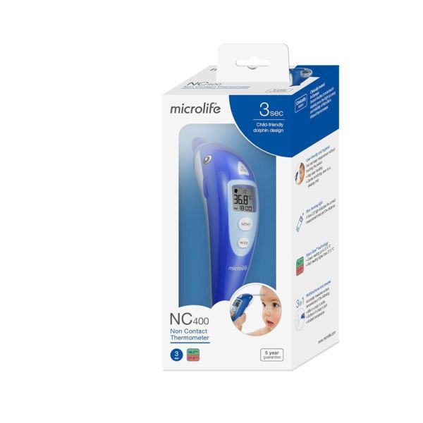 Le nouveau thermomètre sans contact Microlife NC 400, outre sa fiabilité, sa précision et sa facilité de manipulation, permet une mesure douce et non invasive de la température corporelle sans toucher le patient. Le design unique du dauphin a été spécialement conçu pour rendre la mesure plus agréable pour les enfants.