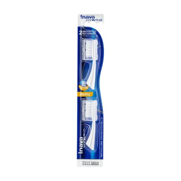 Les spécialistes de l’hygiène bucco-dentaire recommandent de changer de brosse à dents tous les trois mois et cela concerne également les têtes des brosses à dents électriques. Avec leurs brins doux en nylon de haute qualité et finement arrondis à leur extrémité, les recharges Inava Hybrid Timer nettoient précisément et en douceur les dents et gencives. Comme les véritables brosses à dents Inava, elles sont assainissables, il suffit de placer la tête au micro-ondes (en présence d’eau) une minute à 600 W pour les rendre à nouveau parfaitement propres et retirer 99,99% des virus et bactéries présents sur la brosse (2). Existe en trois tailles de brins : des brins sensibilité (18/100° effilés 1/100° à leur extrémité), des brins 15/100° Extra-souples, des brins 20/100° Souples.